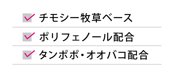 | 原材料 | チモシーミール、ホミニーフィード、アルファルファミール、小麦ふすま、小麦粉、タンポポ粉末、ポリフェノール、オオバコ粉末、植物抽出発酵エキス、ミネラル類(食塩、炭酸カルシウム、硫酸亜鉛、硫酸銅、ヨウ素酸カルシウム)、ビタミン類(A、B1、B2、B6、C、D3、E、K、ニコチン酸、D-パントテン酸カルシウム、葉酸)、アミノ酸類(DL-メチオニン)、甘味料(ソーマチン) |