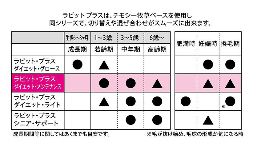 ラビットプラスは、うさぎの成長と健康維持のために 高繊維質なチモシー牧草を主原料に、年齢や体の 状態に合わせた栄養成分の調整を行ったプレミアムフードです。 食事の変化に敏感なうさぎの習性を考え、シリーズでの 切り替えが容易に行える様に、同じベースを使用しています。 |