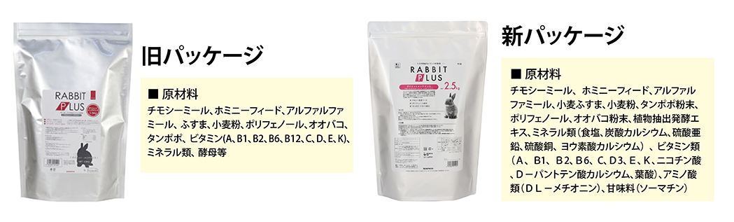 | 原材料 | チモシーミール、ホミニーフィード、アルファルファミール、小麦ふすま、小麦粉、タンポポ粉末、ポリフェノール、オオバコ粉末、植物抽出発酵エキス、ミネラル類(食塩、炭酸カルシウム、硫酸亜鉛、硫酸銅、ヨウ素酸カルシウム)、ビタミン類(A、B1、B2、B6、C、D3、E、K、ニコチン酸、D-パントテン酸カルシウム、葉酸)、アミノ酸類(DL-メチオニン)、甘味料(ソーマチン) |