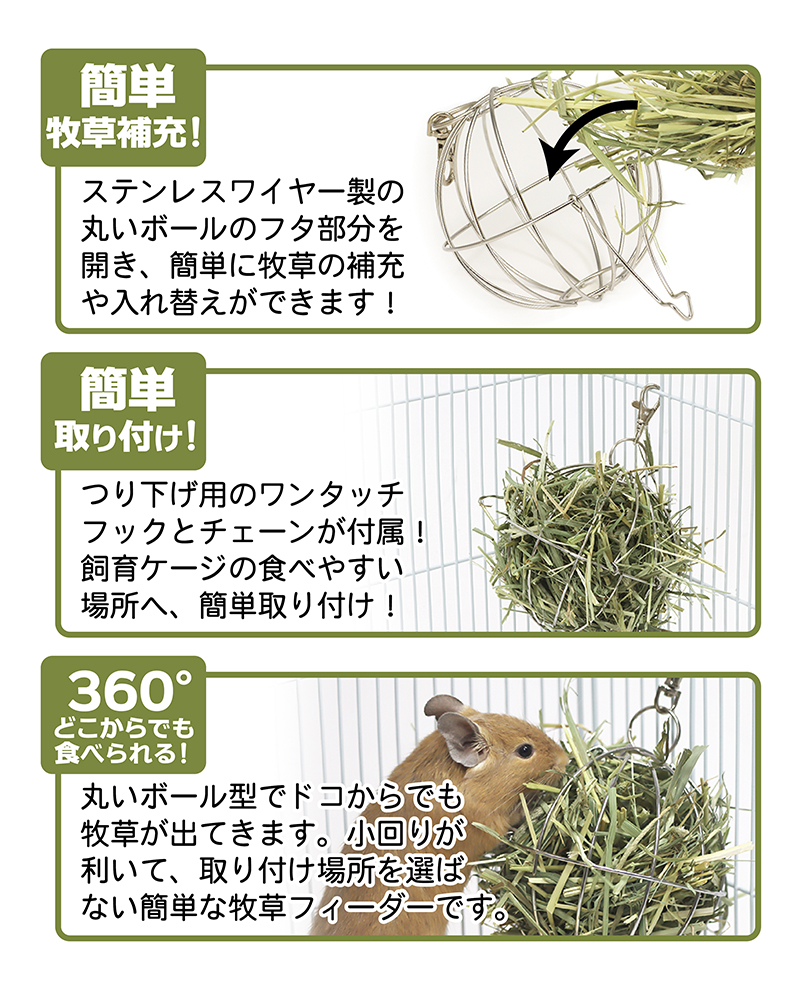 | 簡単牧草補充!簡単取り付け! 360°どこからでも食べられる! ステンレス製牧草フィーダー |