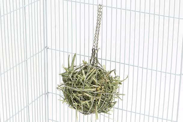 Ball-shaped hay holder made of stainless steel wire, equipped with a one-touch hook and chain for easy hanging in cage.