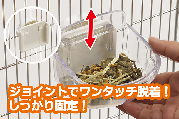 The joint can be securely attached to the cage and easily removed with a one-touch mechanism.Equipped with a locking function, it stays firmly in place to help prevent pets from tipping over the bowl or scattering food.The contents are visible.