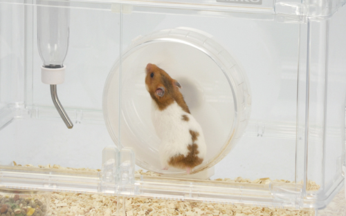 大きく開くガラスの扉で、クリアーな視界 開放感と光溢れる暮らしの空間。 スッキリとしたフォルムの飼育ケース。 ●給水ボトル・食器・ ホイールがセットされたハムスター飼育キット。 |