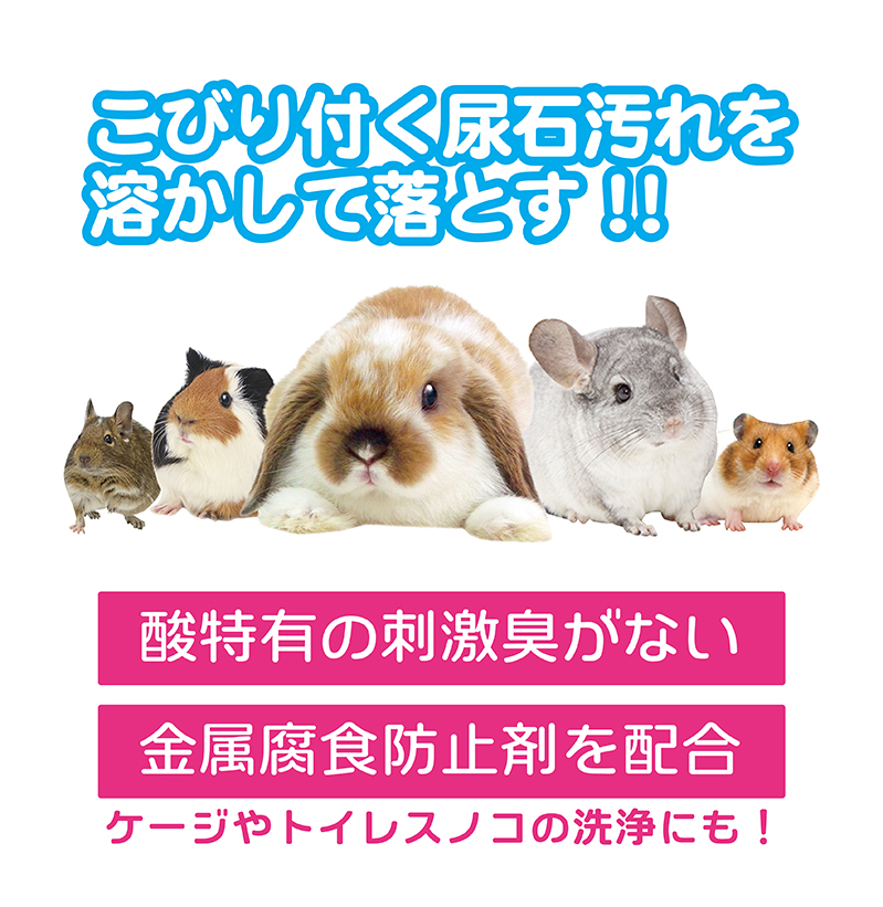 | 頑固な尿石を溶かしてスッキリ トイレやケージにこびり付いて ニオイの元になる尿石汚れを、 パワフルに分解して素早く除去します! |