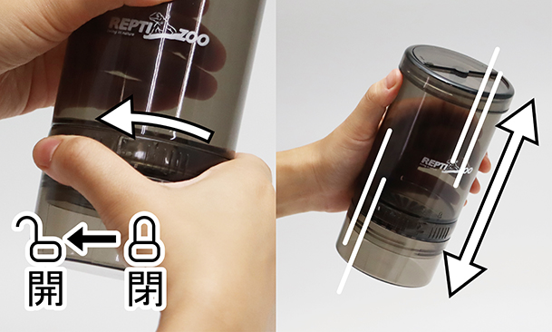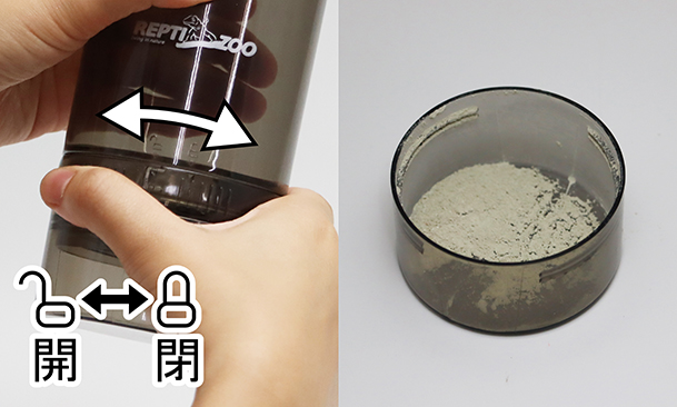 ②回転ロックを開け、上下に振り生き餌にダスティングします。 |