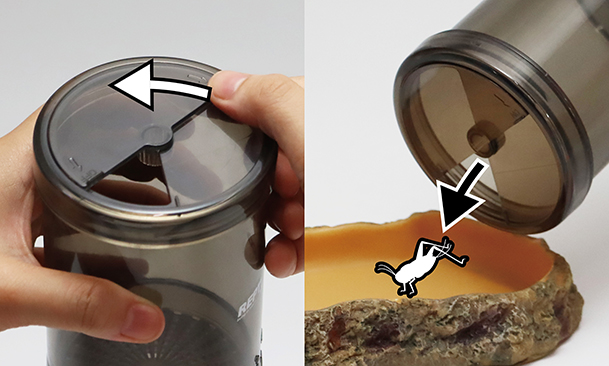 ①下部ボックスにパウダーを入れ、上部ボックスと連結させます。上部フタから生き餌を入れ、フタを閉じます。 |