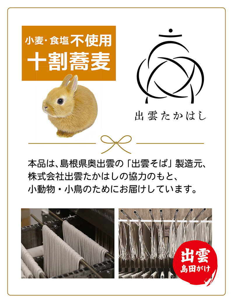 | 小動物や小鳥が大好きな蕎麦の実を使った、 スティックタイプの ポリポリ美味しいヘルシーおやつ! おそばには、良質なたんぱく質やビタミンB群等の うれしい栄養が含まれています。 生き物のための専用レシピで |